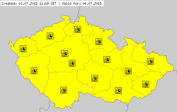 Výstraha před lesními požáry platí pro celé Česko až do odvolání. Nejhorší je situace na jižní Moravě a ve středních Čechách. Hrozí nebezpečí požárů o rozloze několika ha, s několikadenní dobou trvání. V přírodě nerozdělávejte oheň. (snímek: meteoalarm.eu)